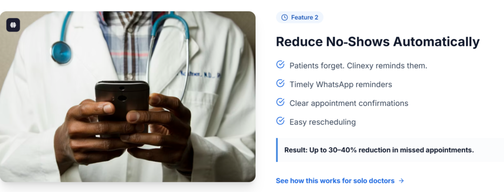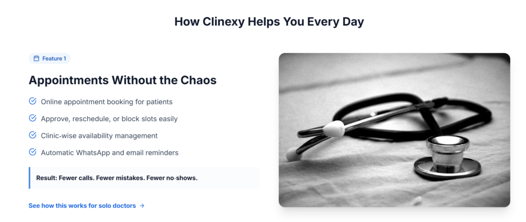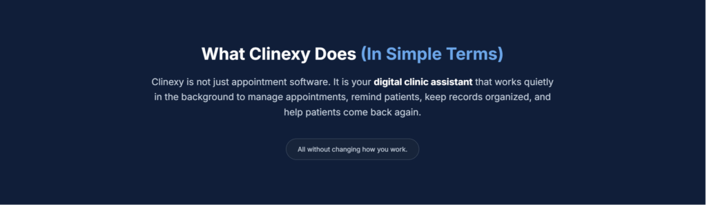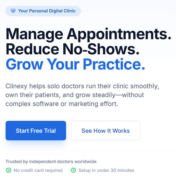 Clinexy helps solo doctors run their clinic smoothly, own their patients, and grow steadily—without complex software or marketing effort.